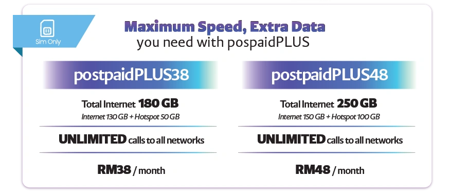 - Monthly access fee for the postpaidPLUS38 and postpaidPLUS48 plan is only applicable for the bundled high speed data, hotspot data and unlimited voice calls to all networks in Malaysia and fixed line numbers, not for video calls and voice calls to special numbers.