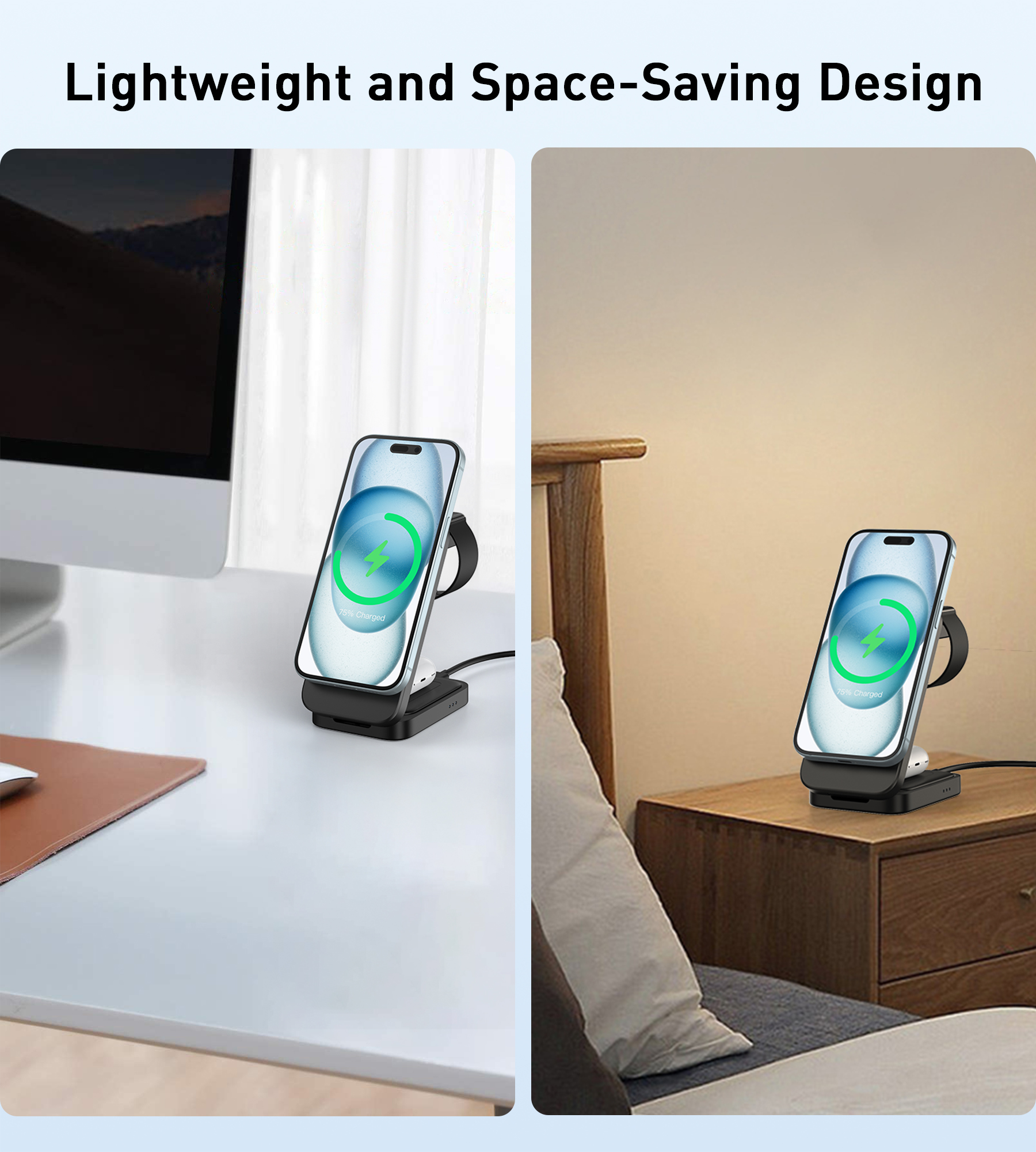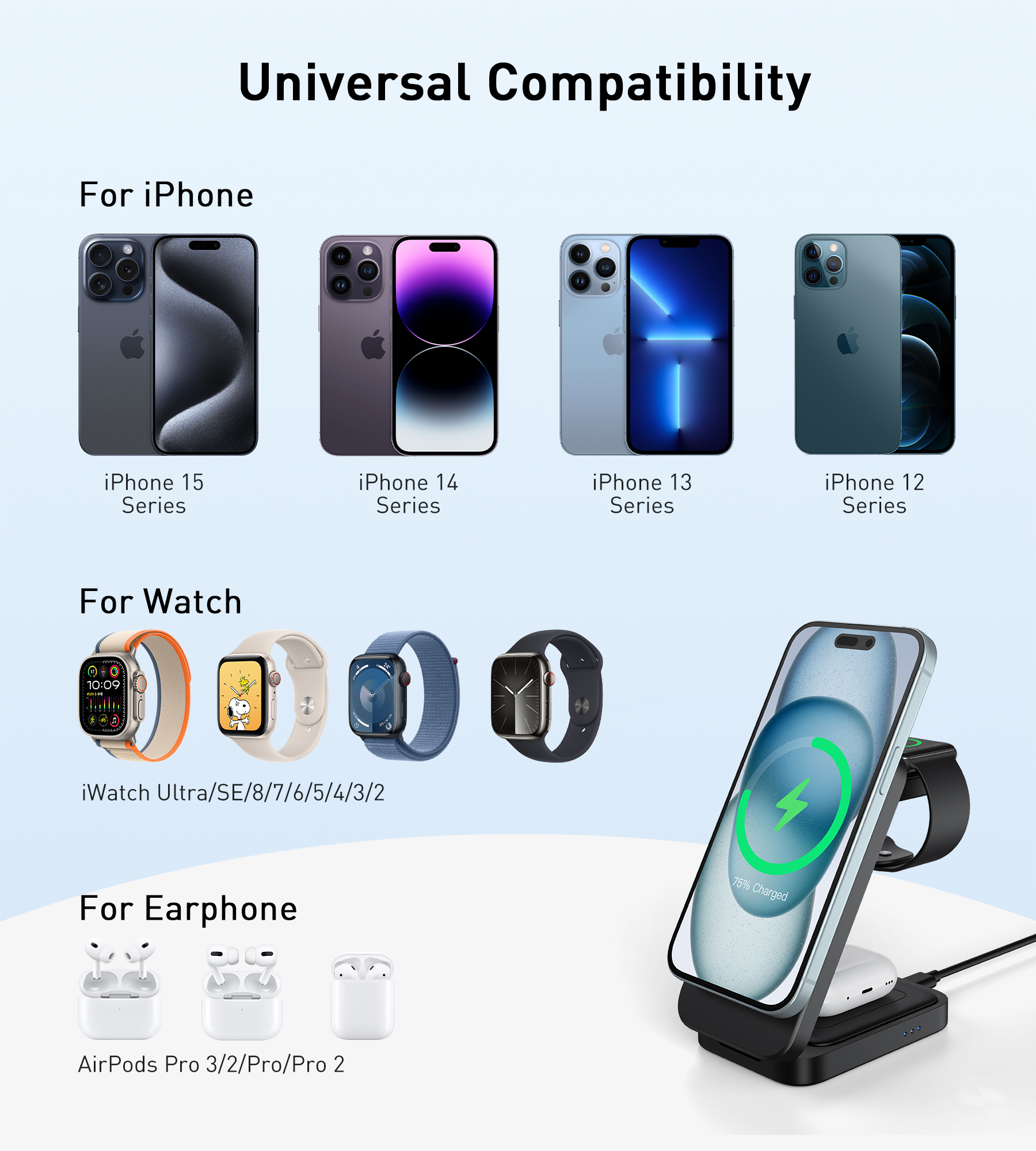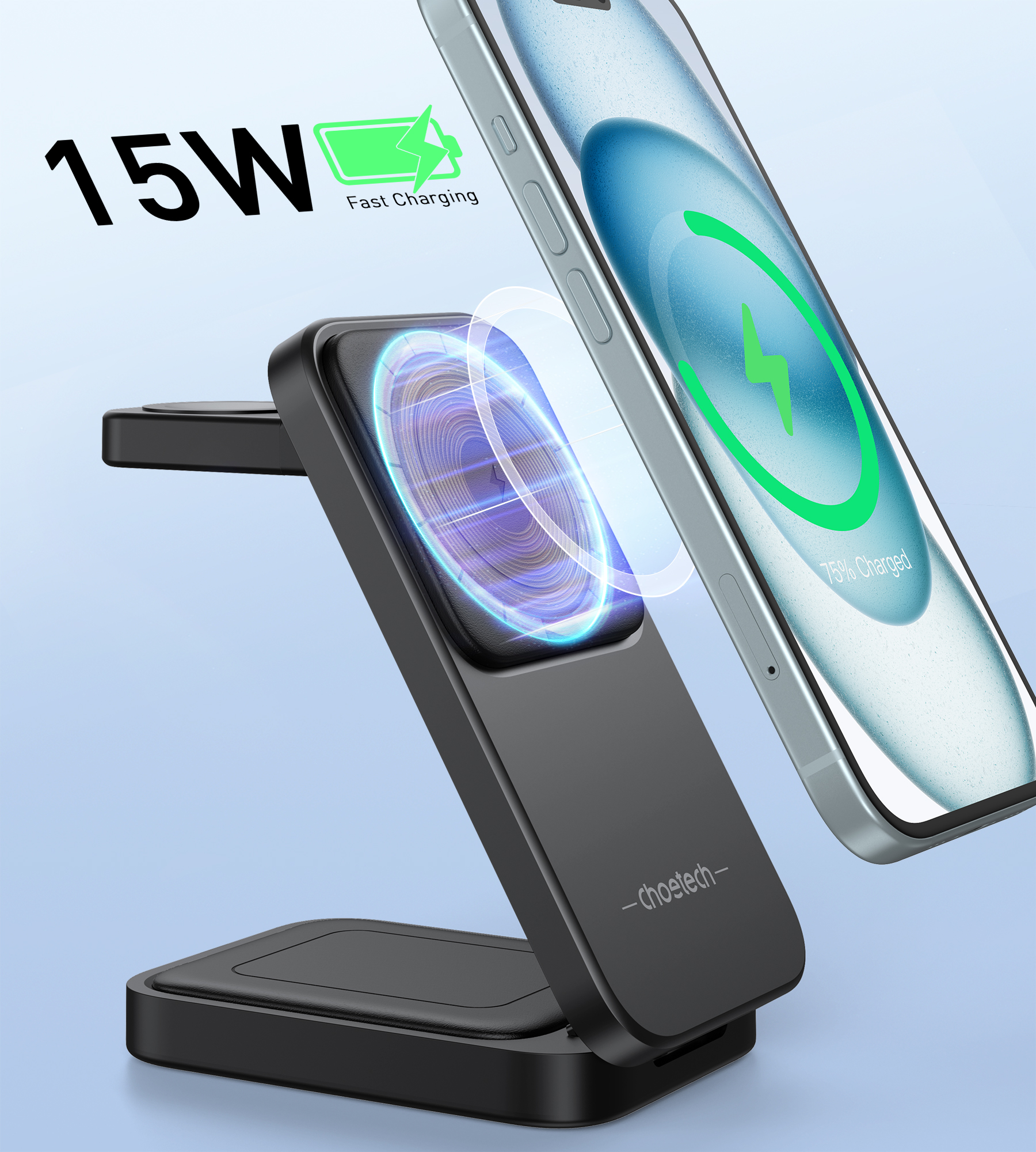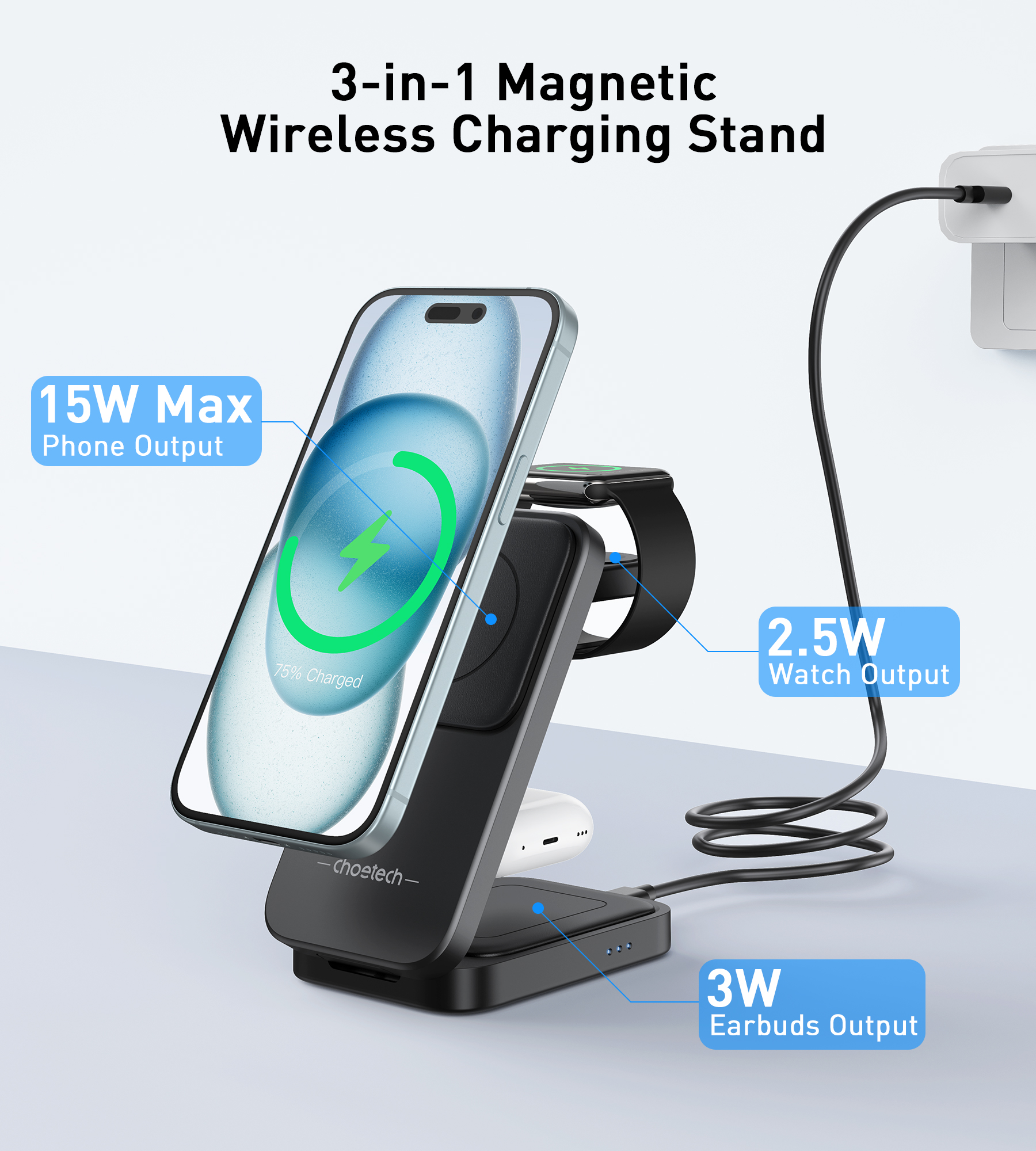 3-in-1 Magnetic Wireless Charging Stand: 15W Max Phone Output, 2.5W Watch Output, 3W Earbuds Output