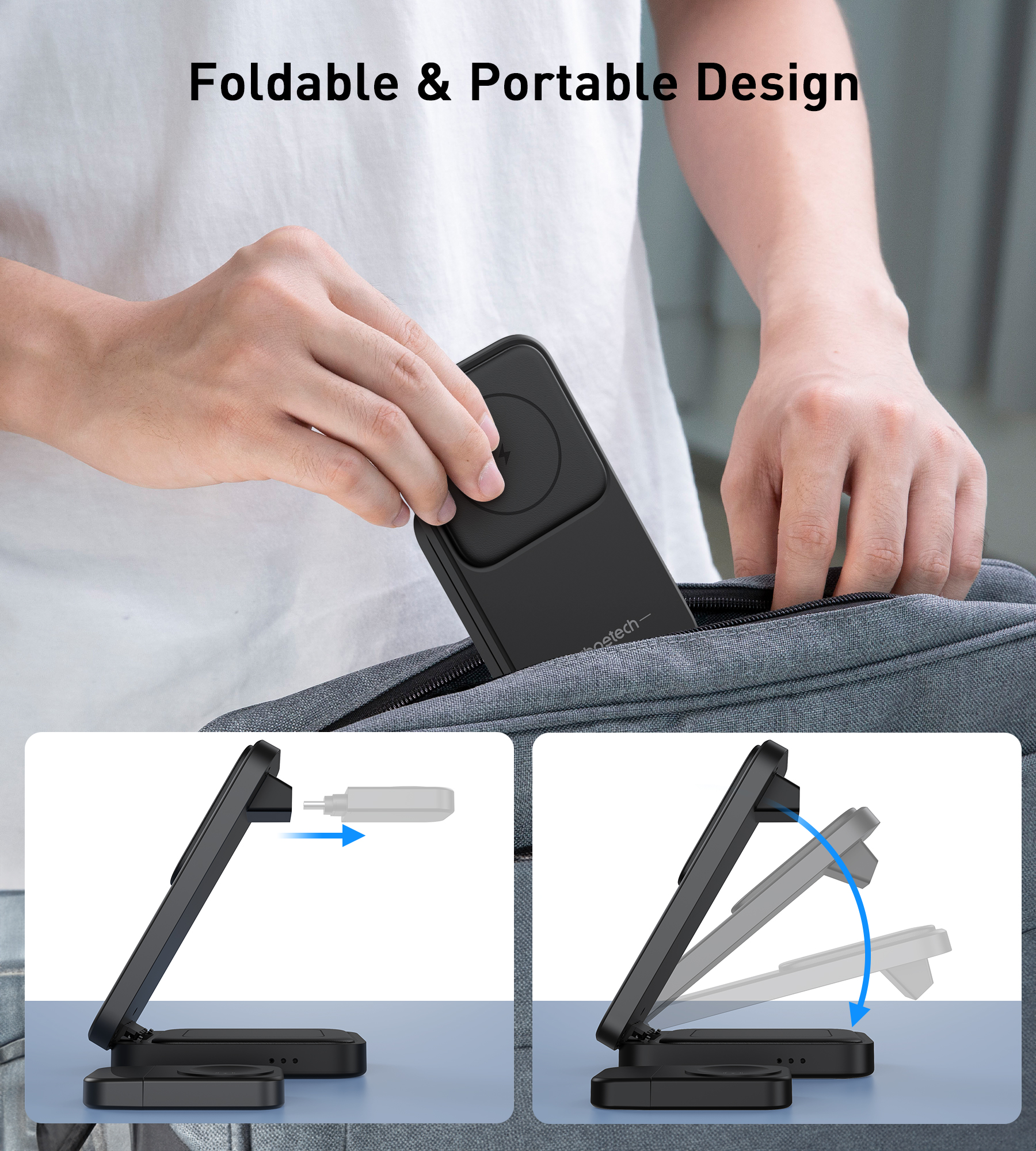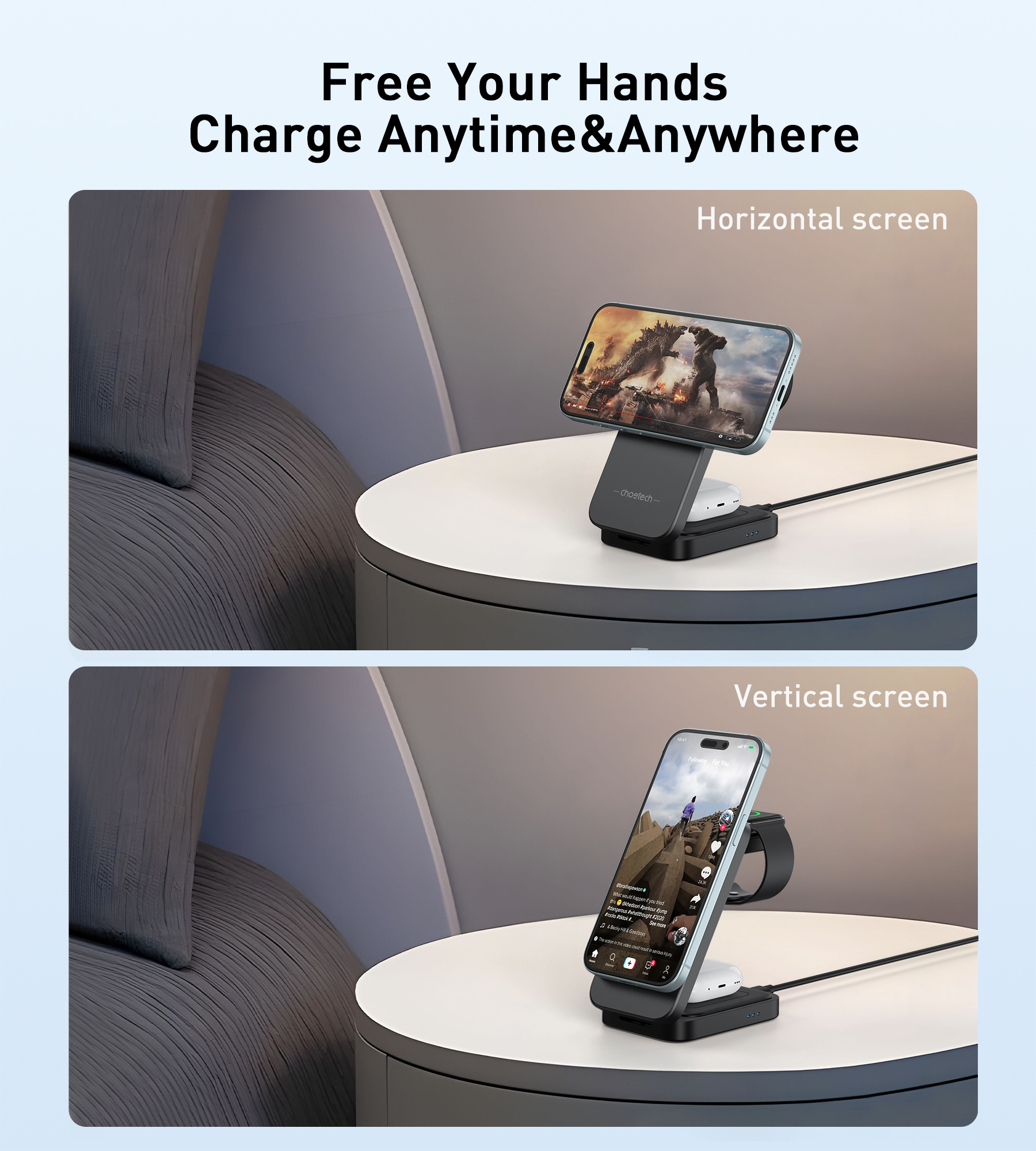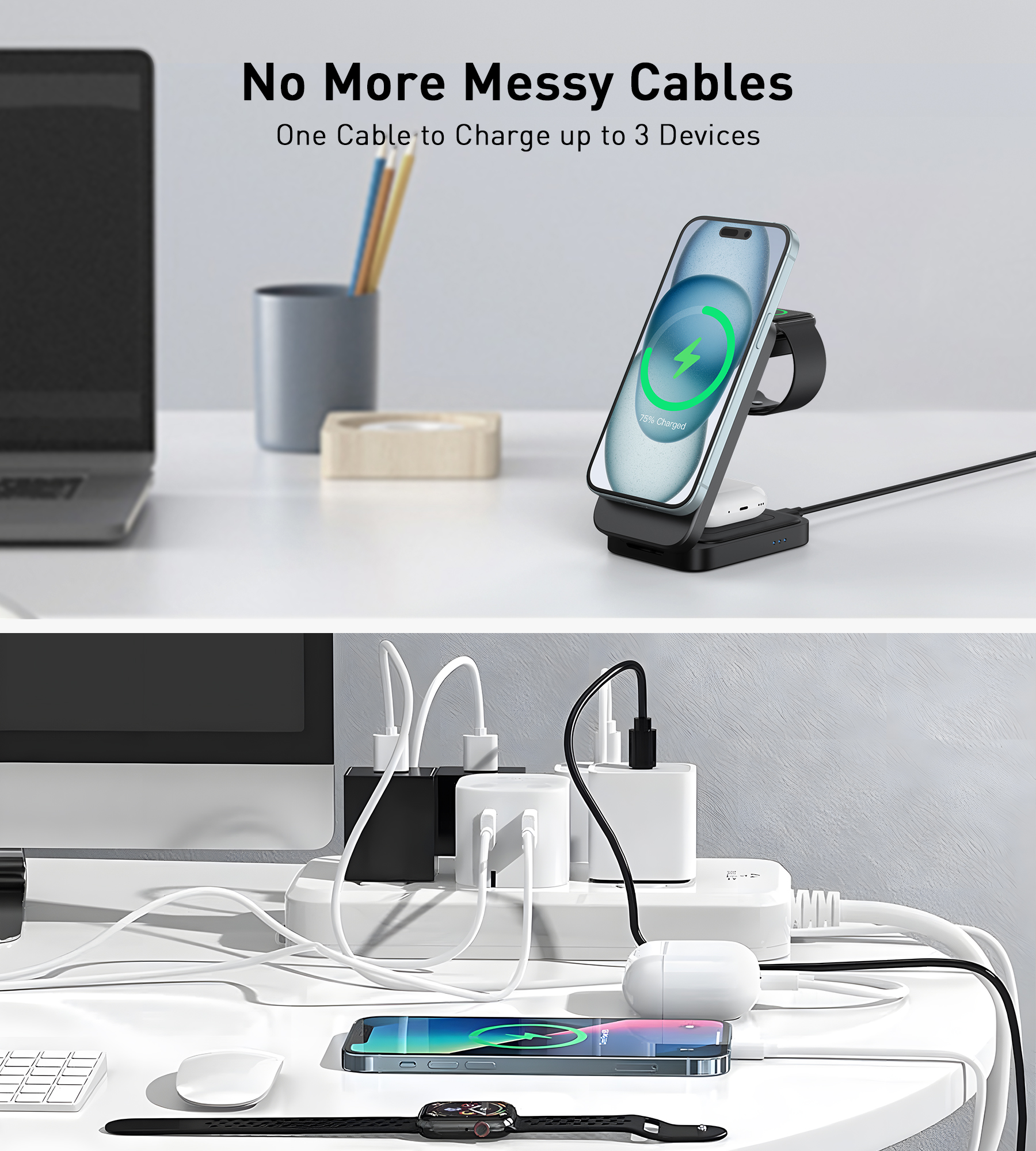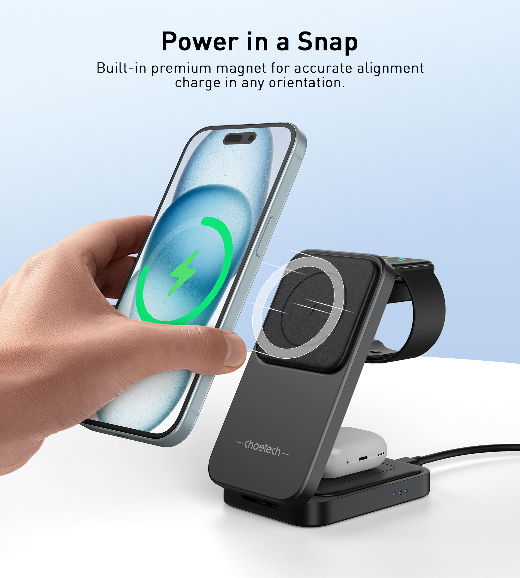 3-in-1 Magnetic Wireless Charging Stand: 15W Max Phone Output, 2.5W Watch Output, 3W Earbuds Output
