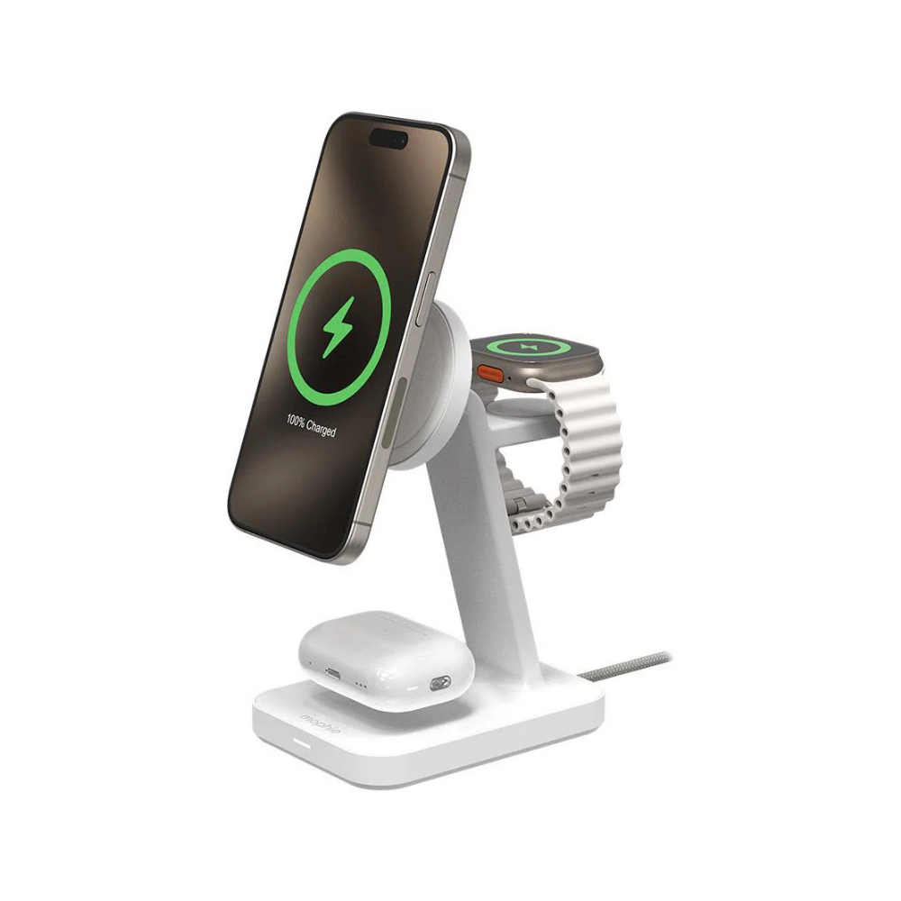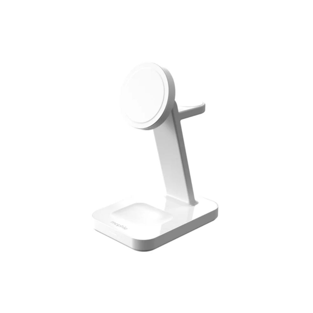Charge your phone, Apple Watch, and AirPods with the snap+ 3-in-1 wireless charge stand. This Qi2-certified wireless charger delivers up to 15W of fast-charging power to your phone. The adjustable charging pad holds your phone magnetically, in landscape or portrait mode. The magnets ensure precise alignment for an optimal charge that begins on contact. The watch charger on the 3-in1 stand delivers up to 7.5W of fast-charging power to your Apple Watch. The stand even has a designated charging spot for AirPods that delivers up to 5W. The mophie 3-in-1 wireless charge stand eliminates the hassle of cable clutter, saves space on your desk, and charges three devise at once.