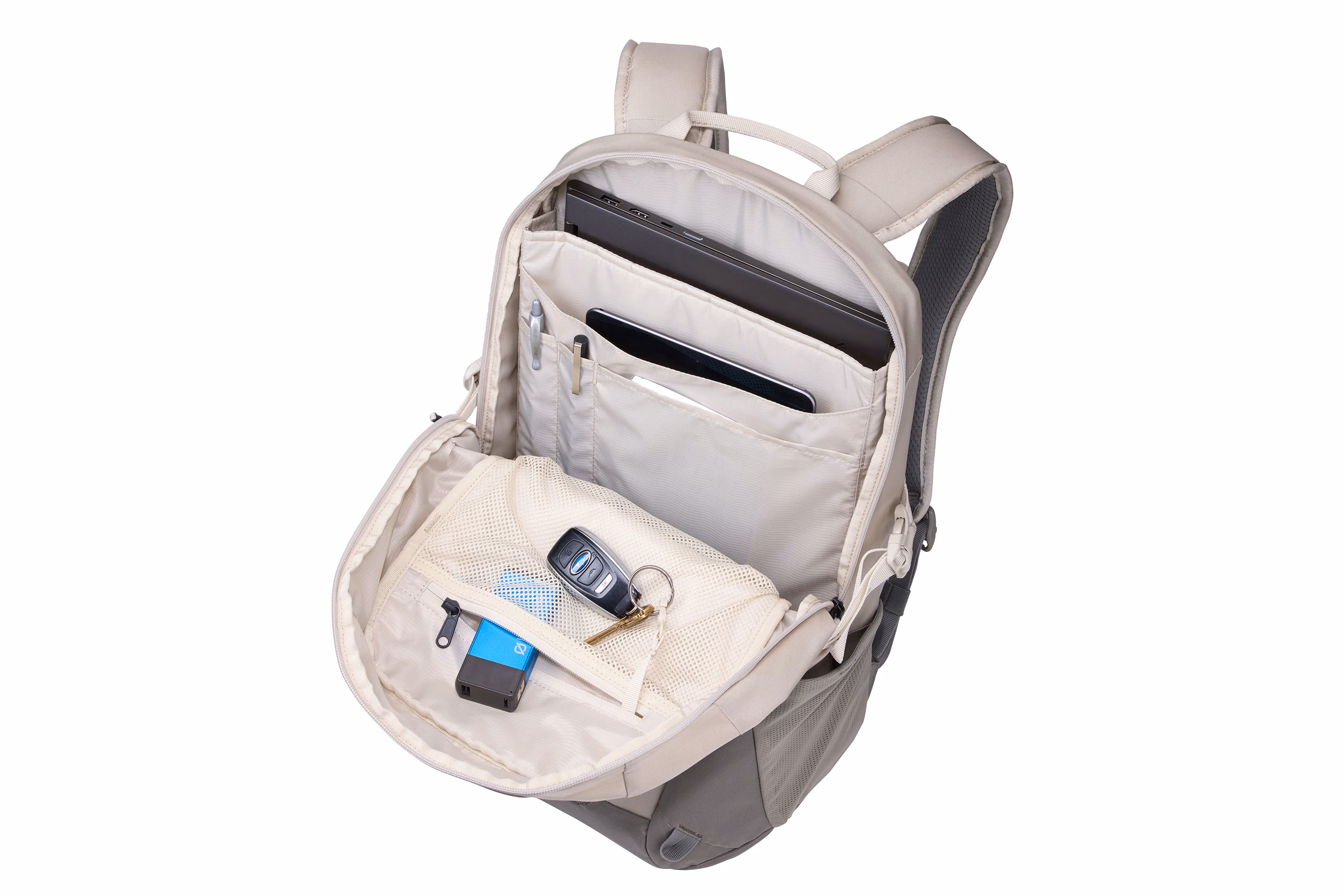 Roomy zipped mesh pocket stretches to add volume to store electronic accessories and other personal items